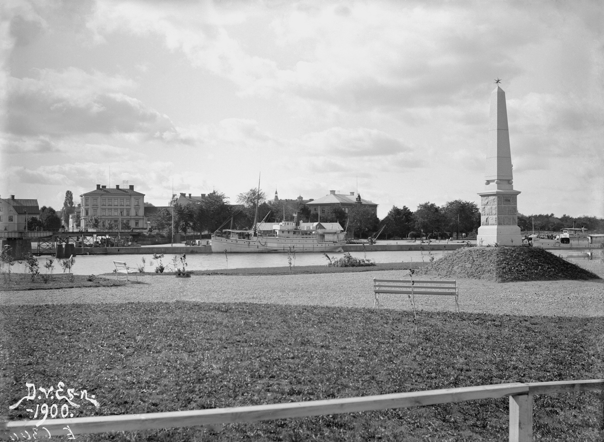 Stångebromonumentet vid Stångåns östra strand i Linköping. Invigt söndagen den 25 september 1898 till minne av stångebroslaget 1598. I bakgrunden Linköpings hamn som fått besök av passagerarfartyget S/S Wisingsö som trafikerade ångbåtsleden Jönköping-Stockholm och till höger ångfartyget Brokind. Det sistnämnd fartyget trafikerade Kinda kanal under åren 1878-1903.
