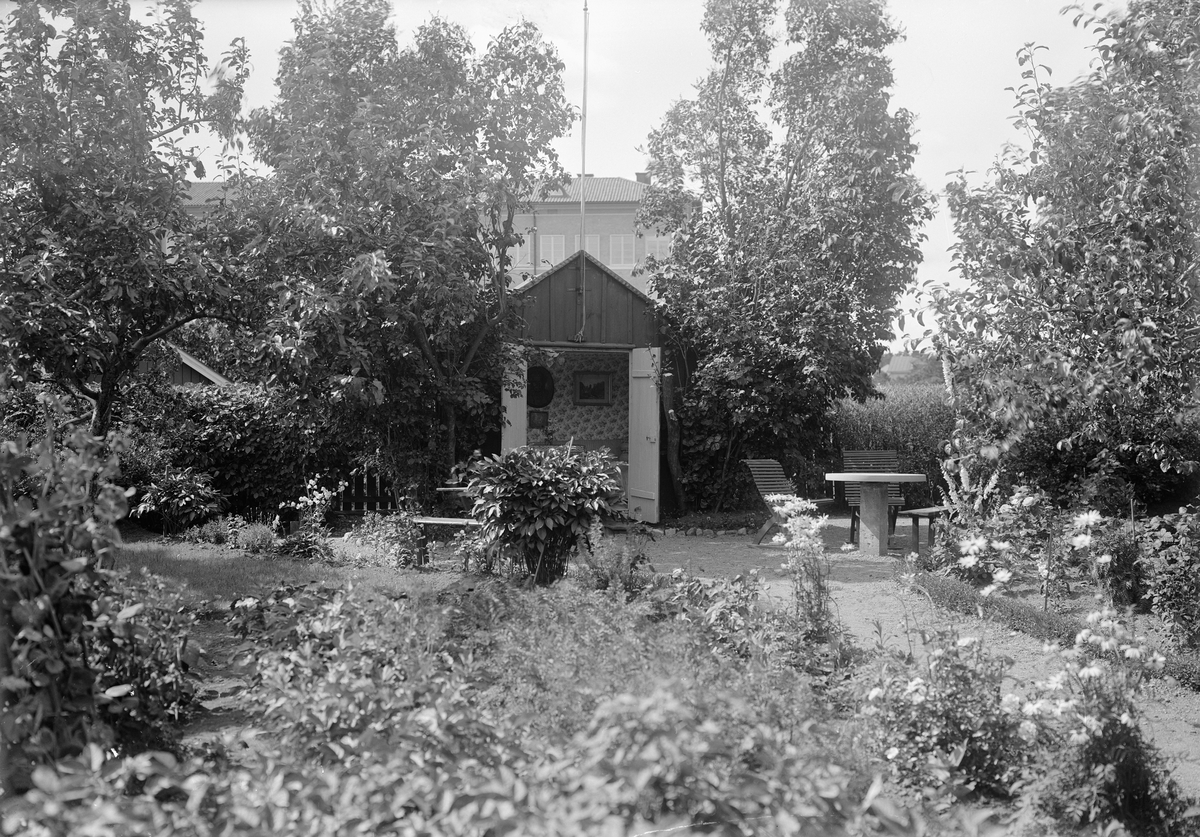 Den prunkande trädgården till Onkel Adamsgården i Linköping. I fonden gårdens lusthus där inte minst läkaren och författaren Carl Johan Wetterbergh (alias Onkel Adam) på sin tid hämtade kraft och inspiration. Sommaren 1929.