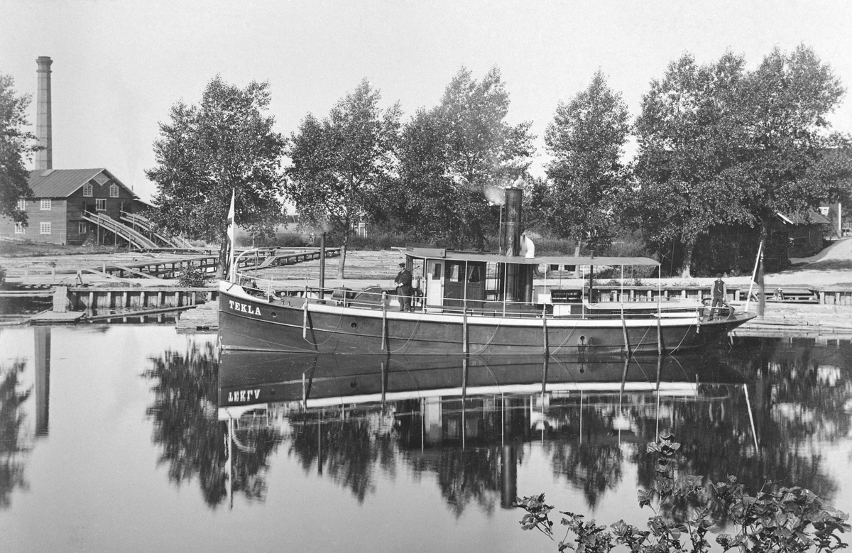Motiv från Linköpings hamnområde 1892. Vid kaj ses bogserångfartyget Tekla, byggd i Stockholm 1889 för trafik på Kinda kanal. Fartyget tillhörde P. Wikström i Stockholm som även ägde Linköpings ångsåg vars anläggning ses till vänster.