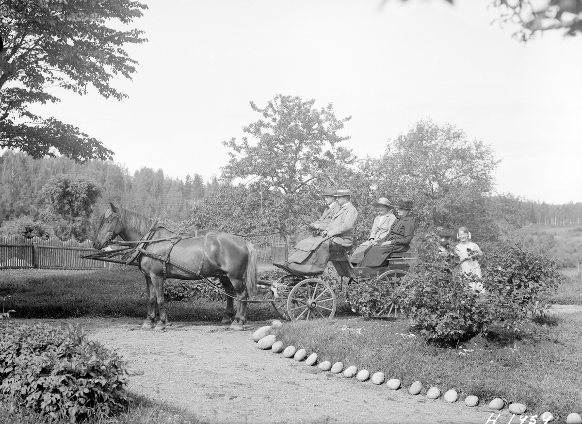 Ett ögonblick från Foxarps gård i Västra Ryd. Gårdens ägare, Oskar och Gustava Karlsson, har tagit plats i gårdens åkkärra. Vid sidan av sin mor sitter makarnas dotter Märta. Hon är gift med Einar Lindström som håller i tömmarna. Det unga paret arrenderar gården sedan de ingått äktenskap 1923. De bägge barnen bakom vagnen är enligt uppgift Ivar Blixt och Karin Berglund. Ivar är barn i Oxhagen, ett torp på Foxarps ägor. Karins identitet har inte kunnat styrkas.