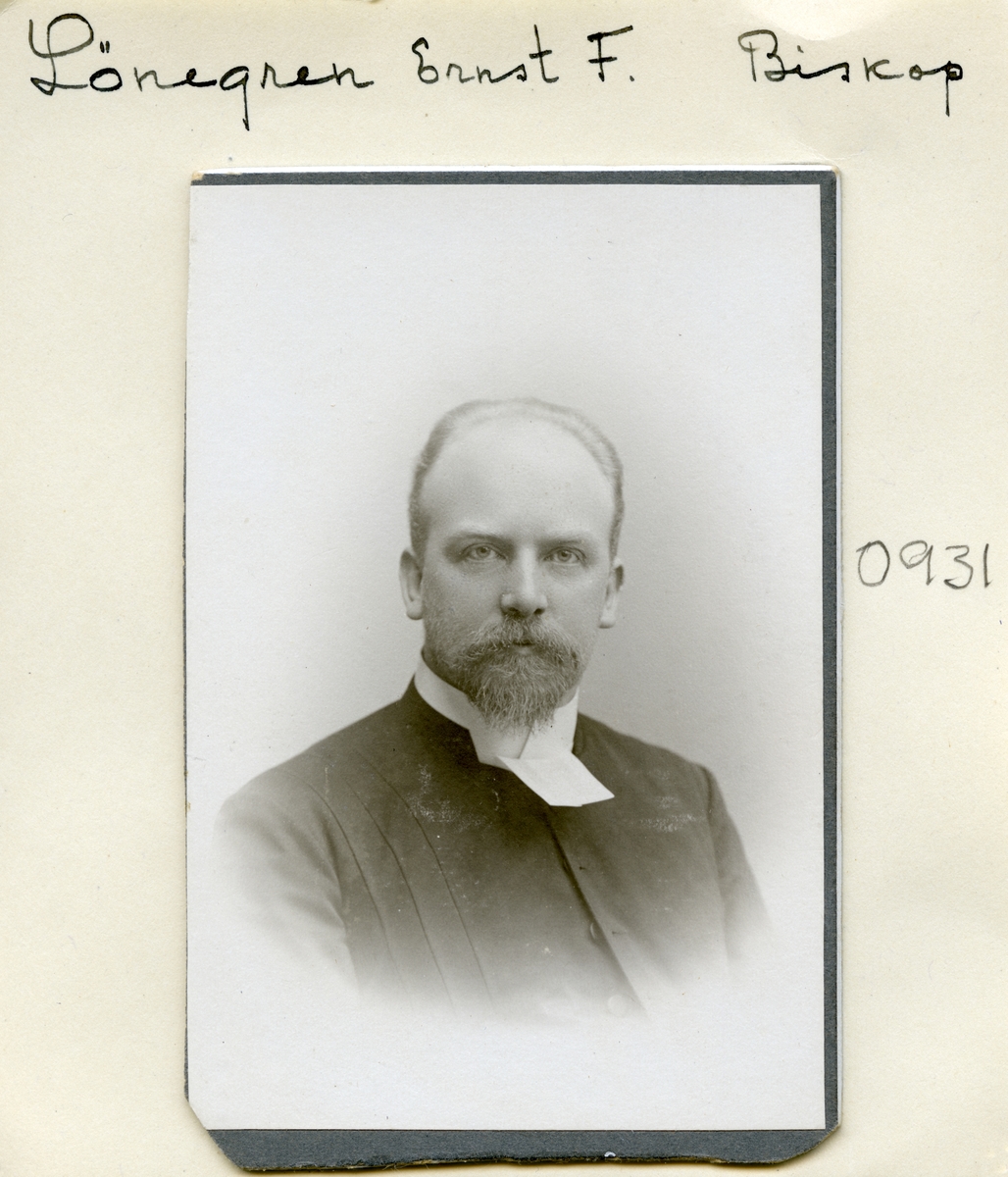 Porträtt av Ernst Lönegren. Född i Stockholm 1862 inflyttade familjen året därpå till Norrköping. Fadern hade där erbjudits tjänsten som tullförvaltare. I vuxen ålder arbetade Ernst som fångpredikant i Norrköping och från 1887 innehade han samma tjänst i Linköping. Från 1889 vice pastor i Kärna och samma år gift med Ester Viktoria Hellström, bördig från Norrköping. Efter tjänst som kyrkoherde i Öved och hovpredikant i Stockholm utnämndes han till biskop över Härnösands stift 1910.