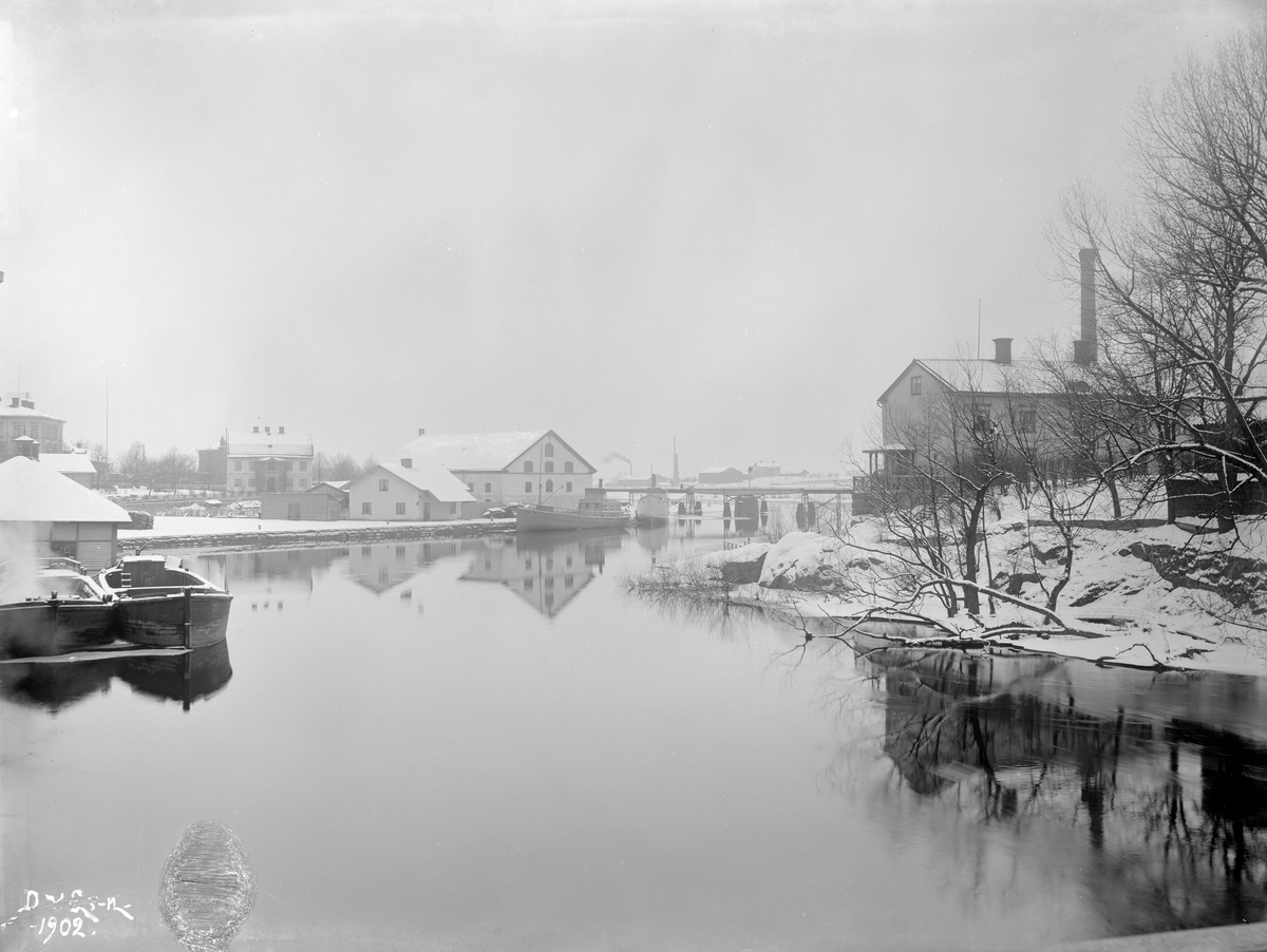 Vintervy i dis från Stångebro med blicken vänd mot norr. I bildens centrum ses Stångs kvarn, uppförd 1803-05 men sedan länge tyst sedan fallet byggts bort för Kinda kanals tillkomst. Närmast till vänster skymtar Stångebro tvättinrättning och till höger på höjden ses kontorsbyggnaden till Linköpings centralbryggeri.