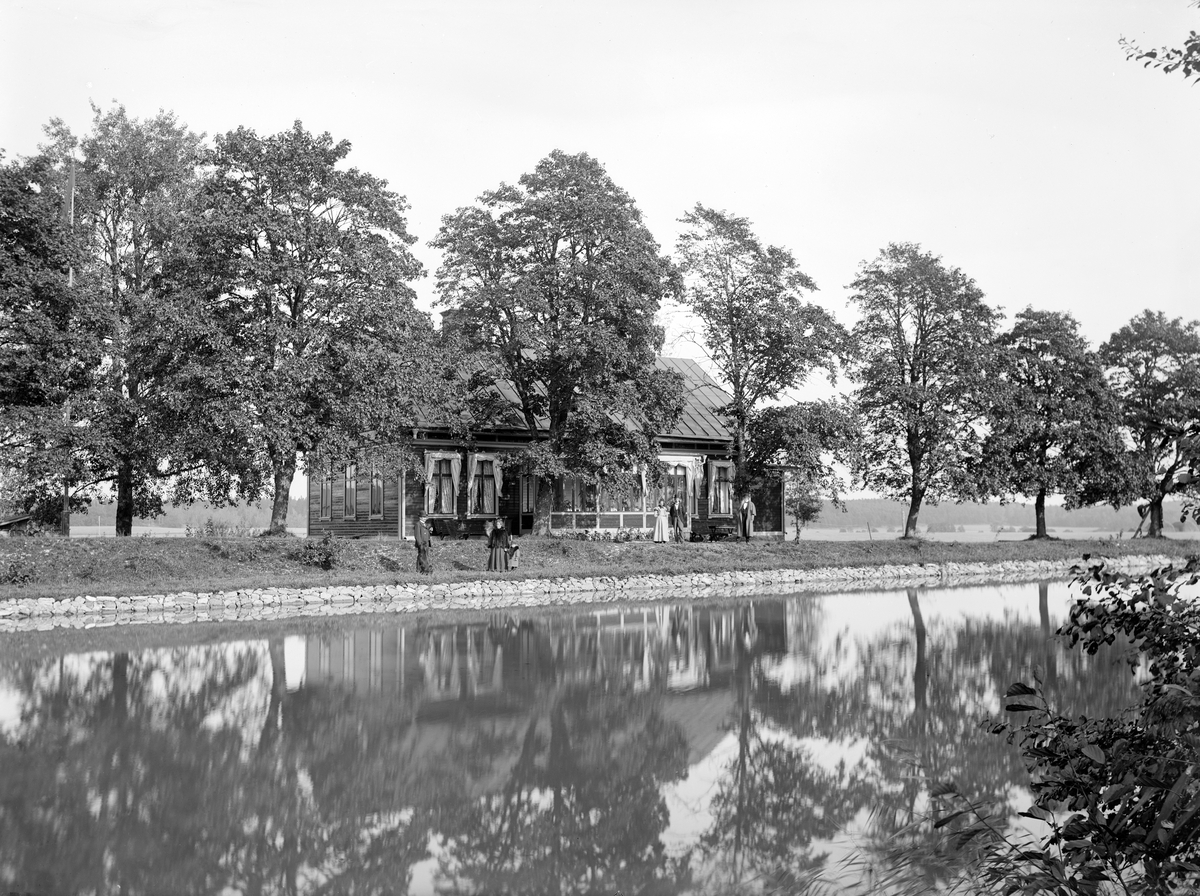 Vy mot praktfull byggnad, vars läge länge gäckat. Känt var att Linköpingsfotografen Didrik von Essen tagit bilden omkring förra sekelskiftet, och att huset ockulärt torde legat utmed Göta kanal. Genom lokal hjälp träder motivet lyckligtvis fram. Intill visshet betraktar vi disponentvillan till Råby chokladfabrik. Till företaget hade man under 1890-talet knutit den driftige Olof German Svensson. Då någon lämplig bostad för den nytillträdde disponenten inte gick att finna i Råby, lät man sannolikt uppföra en värdig bostad på Råbys ägor mot kanalen. Att husets läge hittills varit svår att finna förklaras av att det redan år 1906 flyttades till Malfors, där Cloetta från 1902 övertagit Råbys roll och etablerat ny fabrik. På sin nya plats kom bildens hus vidare att fungera som tjänstemannamäss. Paret närmast vattnet i bilden visar just Olof German Svensson vid sidan av hustrun Nanna med parets äldste son Hjalmar i handen.