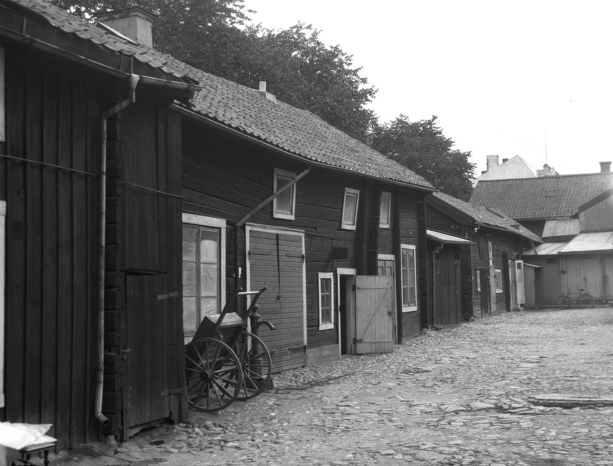 Gårdsinteriör från den så kallade Tornbergska gården i Linköping. Uthuslängan låg utmed Sankt Larsgatan. Den bortre byggnaden med adressen Sankt Larsgatan 30 inrymde vid tiden A. S. Carlssons leksaks- och husgerådsaffär. Gårdens huvudbyggnad låg bakom fotografens placering på adressen Storgatan 38. Vy från nordväst.