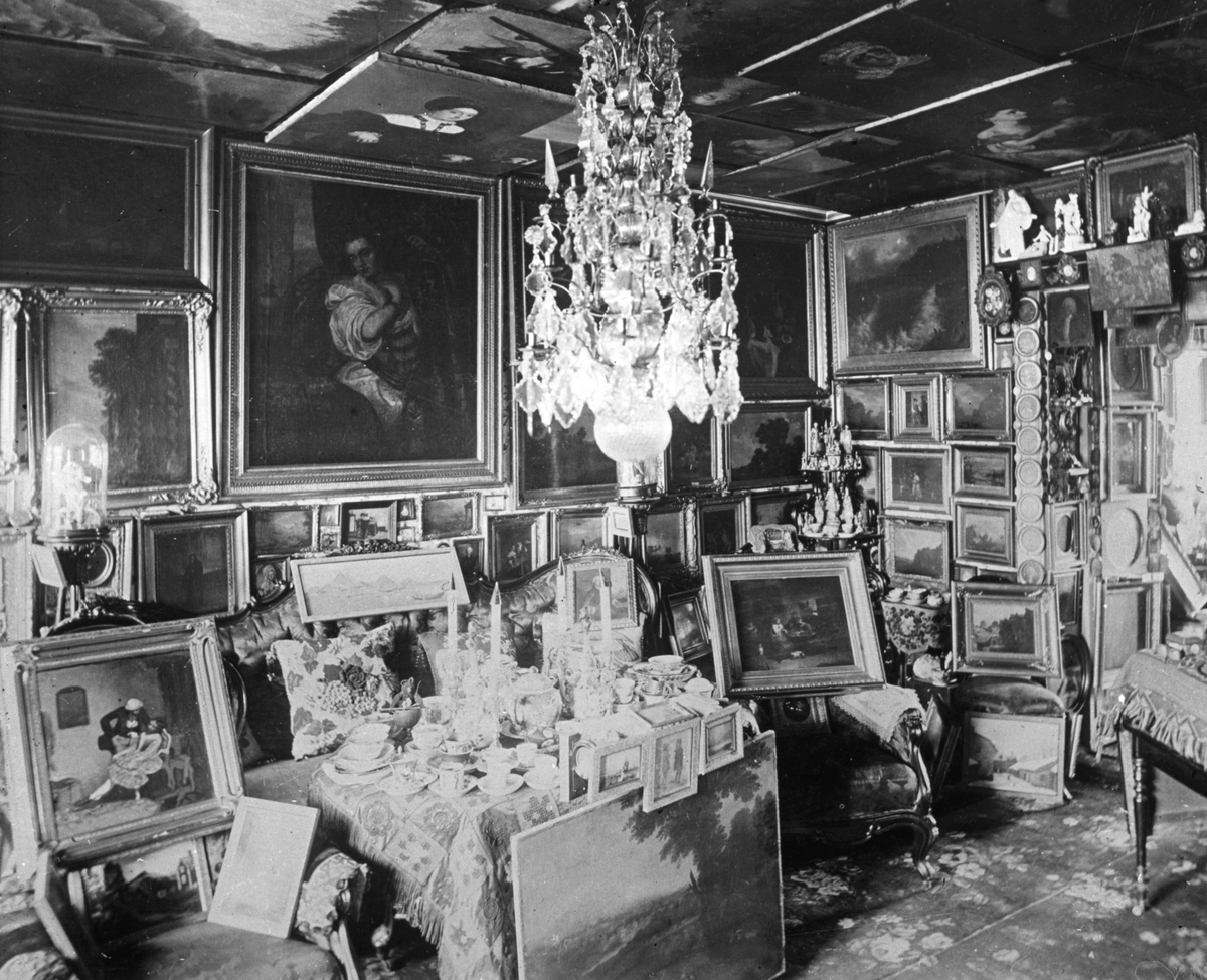 Häradshövding Carl Dahlgrens hem i Stockholm, där hans konstintresse påtagligt manifesterades. Bilden är odaterad men sannolikt tillkommen kort efter Dahlgrens död 1894 och i samband med nedpackningen av hans stora donation till främst Östergötlands museum.
