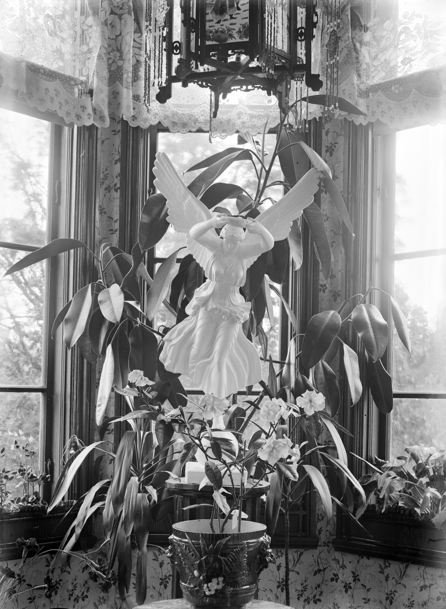 Interiör från Hägerstad slott i Hannäs. Detalj från ett av slottets tornrum där fönsternischen gav plats för ett arrangemang i tidens anda. Daterad till något av 1890-talets senare år, under den period slottet ägdes av protokollsekreterare Ludvig Bäck och dennes makan Carolina, född Malmström.