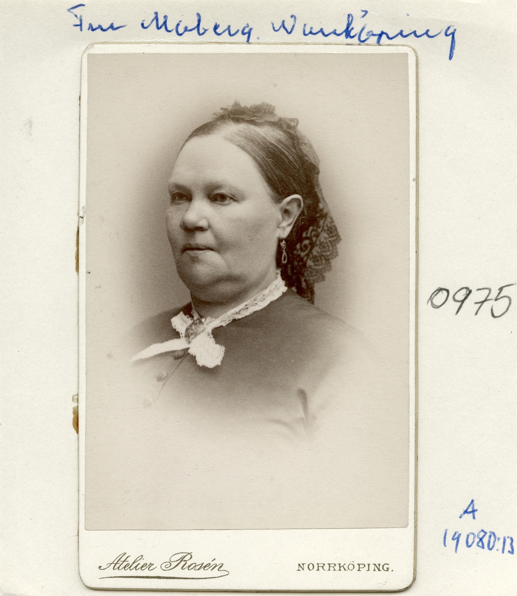 Porträtt av fru Ulrika Josefina Hultgren. Bördig från Södra Vi socken gifte hon sig 1855 med inspektorn och sedermera värdshusvärden Carl Axel Moberg. Maken hade i slutet av 1860-talet sadlat om från tjänst vid Finspångs bruk till att driva ortens värdshus. År 1870 flyttade makarna till Söderköping för att där driva stadens gästgiveri. 1874 flyttade de till Norrköping för fortsatt verksamhet inom mat och dryck. Där fick hon uppleva hennes enda barn, sonen Carl Axel, utvandra till Brasilien för att återkomma och återigen flytta, nu till Amerika.