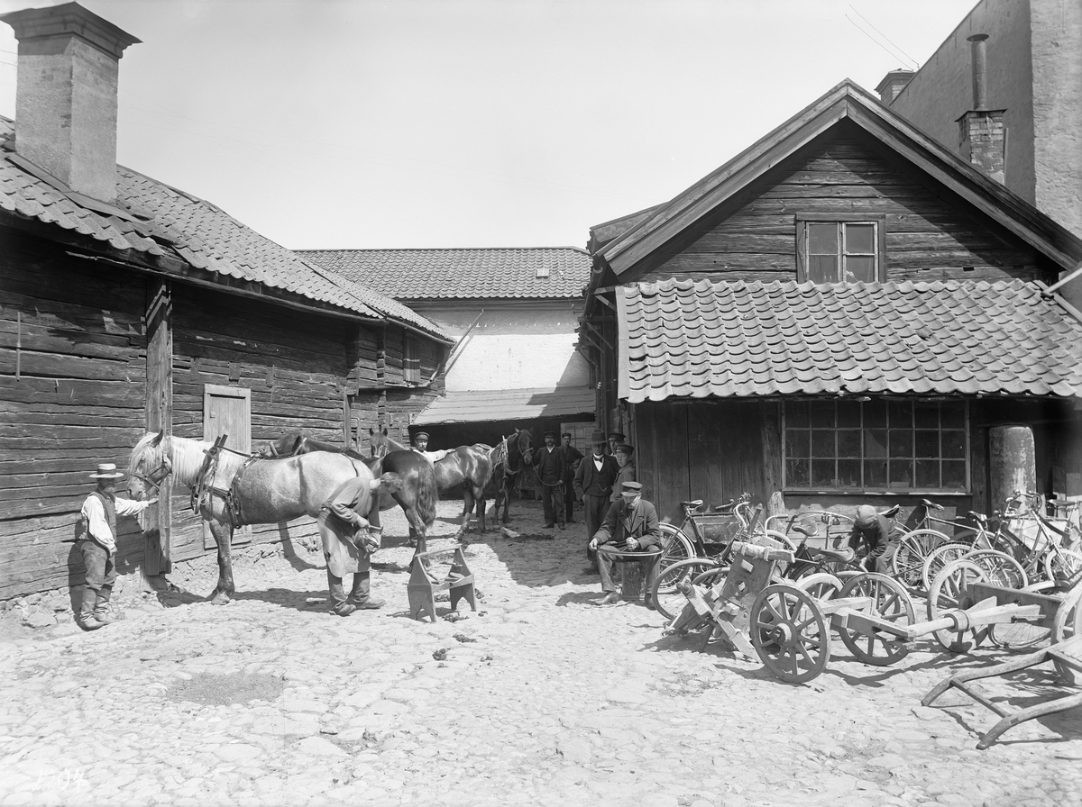Gårdsinteriör från Stenhusgården, Storgatan 56 i Linköping. Vid tiden bedrev smeden Carl Johan Hall sin verksamhet på gården. Här skoddes hästar och lagades vagnar, den nya tiden representeras av att även cykelreparationer utfördes.