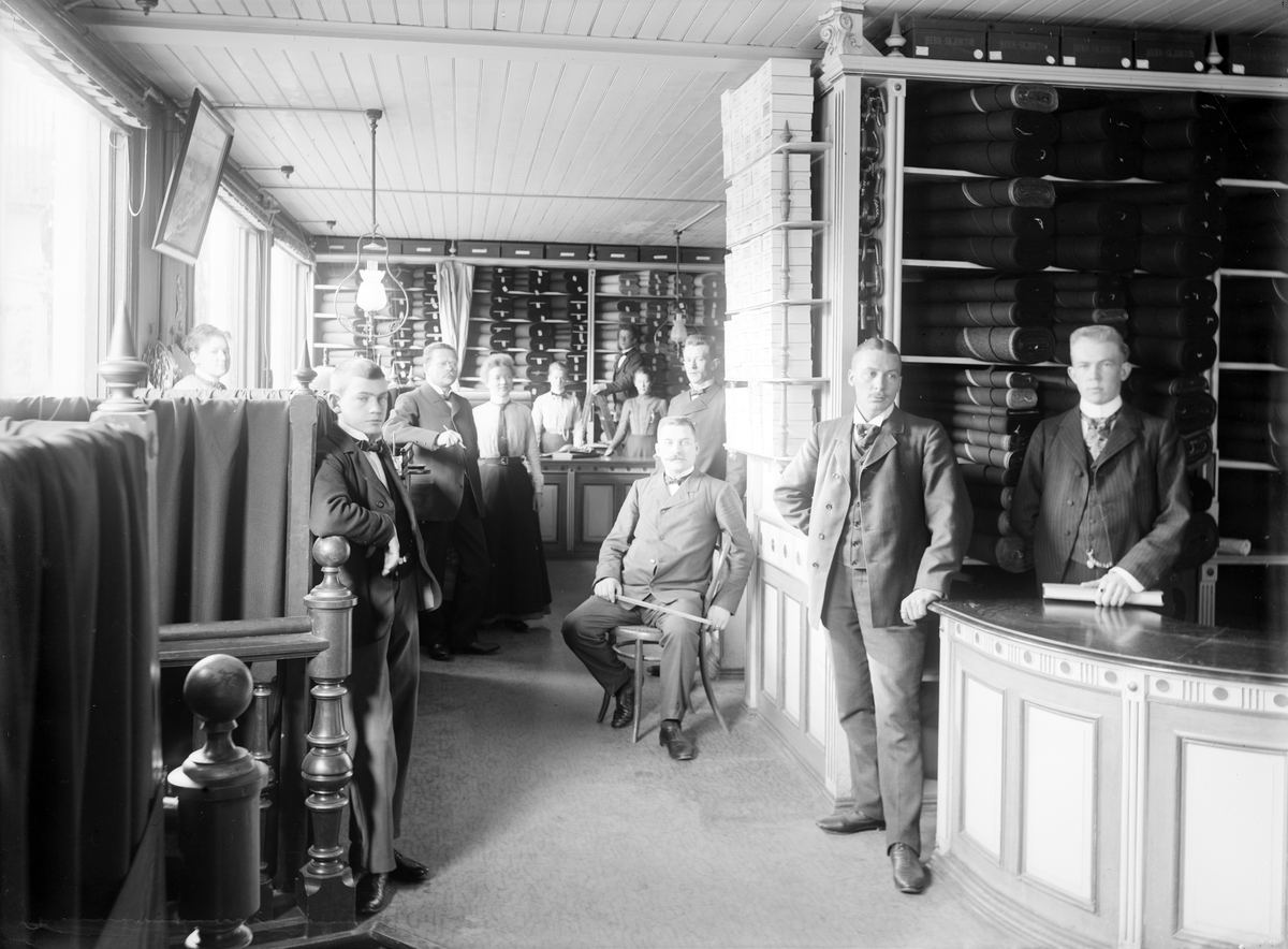 Köpmannen Axel Karlsson kom med tiden att bli en av Linköpings ledande män. Han deltog bland annat aktivt i skapandet av såväl Mellersta Östergötlands järnväg och sockerfabriken som nya teatern. Under 1880-talet kunde han köpa den så kallade Holmbergska gården utmed Storgatan och där etablera ett inkomstbringande handelshus. Bilden visar affärens personalstyrka omkring förra sekelskiftet.