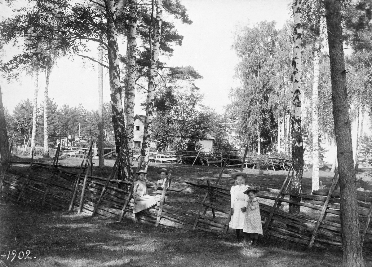 Sommaridyll i Roxenbaden 1902. Barnen hörde sannolikt hemma bland de välbeställda linköpingsfamiljer som vid tiden låtit uppföra sommarbostader i det populära området med behändigt avstånd från staden. I bakgrunden skymtar emellertid exempel på äldre bebyggelse, bostadshuset till lantbruket Lilla Sandvik.