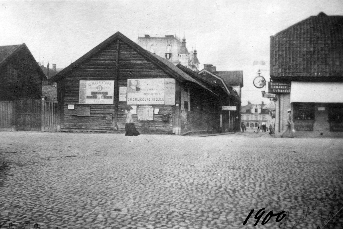 En ankommen vy från Linköping som i sin exklusivitet är väl värd att sprida. Den till synes dubbla dateringen i bildens nedre hörn, 1900 och 1903, stämmer båda väl med vad tidens Linköpingsbor såg från Hospitalstorget med blick vänd mot Bokhållaregatan och vidare Stora torget. Bildens vänstra del upptogs ännu av Westmanska gårdens gytter av trähus. Gårdens huvudbyggnad var av förnämare karaktär och låg med fasad mot Stora torget. En del av byggandens tak och gavel ses bortom huset med brutet takfall. Kort efter bildens tillkomst revs all bebyggelse för att ge plats för Centralpalatset, inflyttningsklart 1909. Till höger ses del av Schenlingska gården, uppkallad efter slottsbokhållaren Petter Schenling. Urmakare Evert Lundbergs långa verksamhet i huset skulle dock med tiden fördunkla det gamla gårdsnamnet.