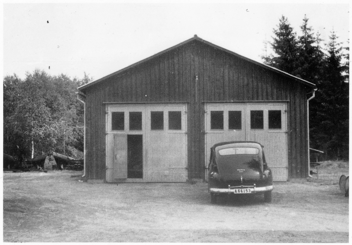 Vägstation S7, filial Gräsmark. Garagebyggnad. Personbil Volvo PV A64153 framför garaget. Till vänster om garaget spetsplogar.