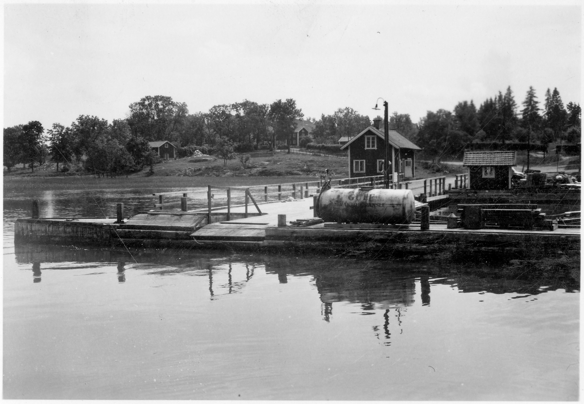 Vägstation E10, Östra Husby. Färjeläget vid Färjestaden. Vy från Bråviken mot land. Färjerampen, till vänster färjvaktarbostad, drivmedelstank, "farmartank", märkt GULF.