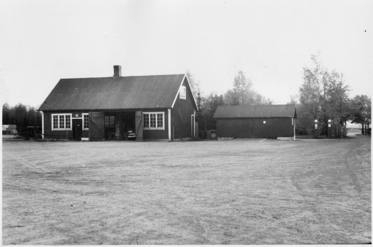 Vägstation N1, Hov. Vy över garageplan med förrådsbyggnader. Bensinpump (drivmedelspump).
