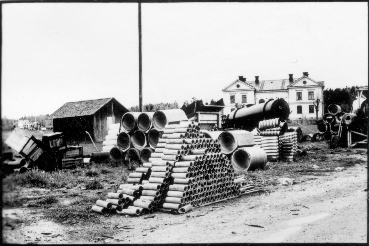 Vägstation Vmo X3, Söderala. Upplag med cementrör och vägtrummor, plåt. I bakgrunden större tvåvåningsbyggnad.
