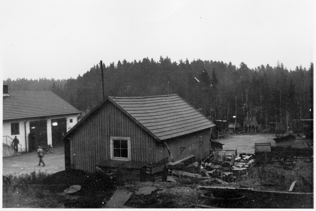 Vägstation P4, Tranemo. Förrådsbyggnad, i bakgrunden vägstationens huvudbyggnad. Upplag av diverse material bakom byggnaden, "skrot". Spetsplog.