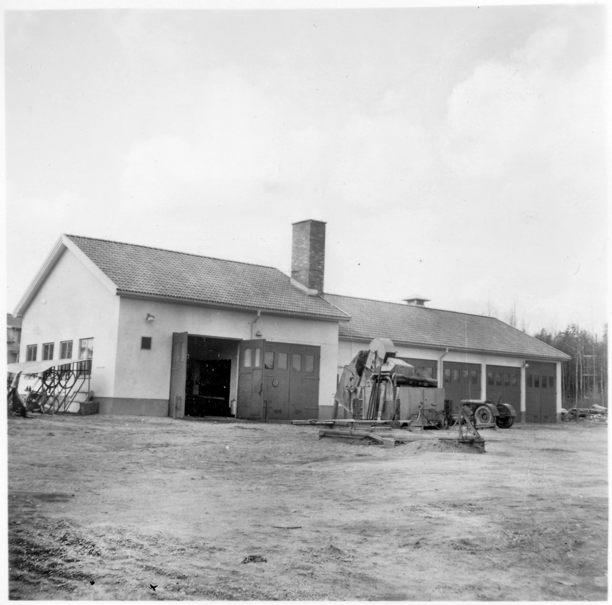 Vägstation Y3, Matfors. Verkstads-, kontors- och garagebyggnad. Vid gavel cykelställ med cyklar. På garageplan traktor och hopfälld väghållningsmaskin, eventuellt ett grussorteringsverk.