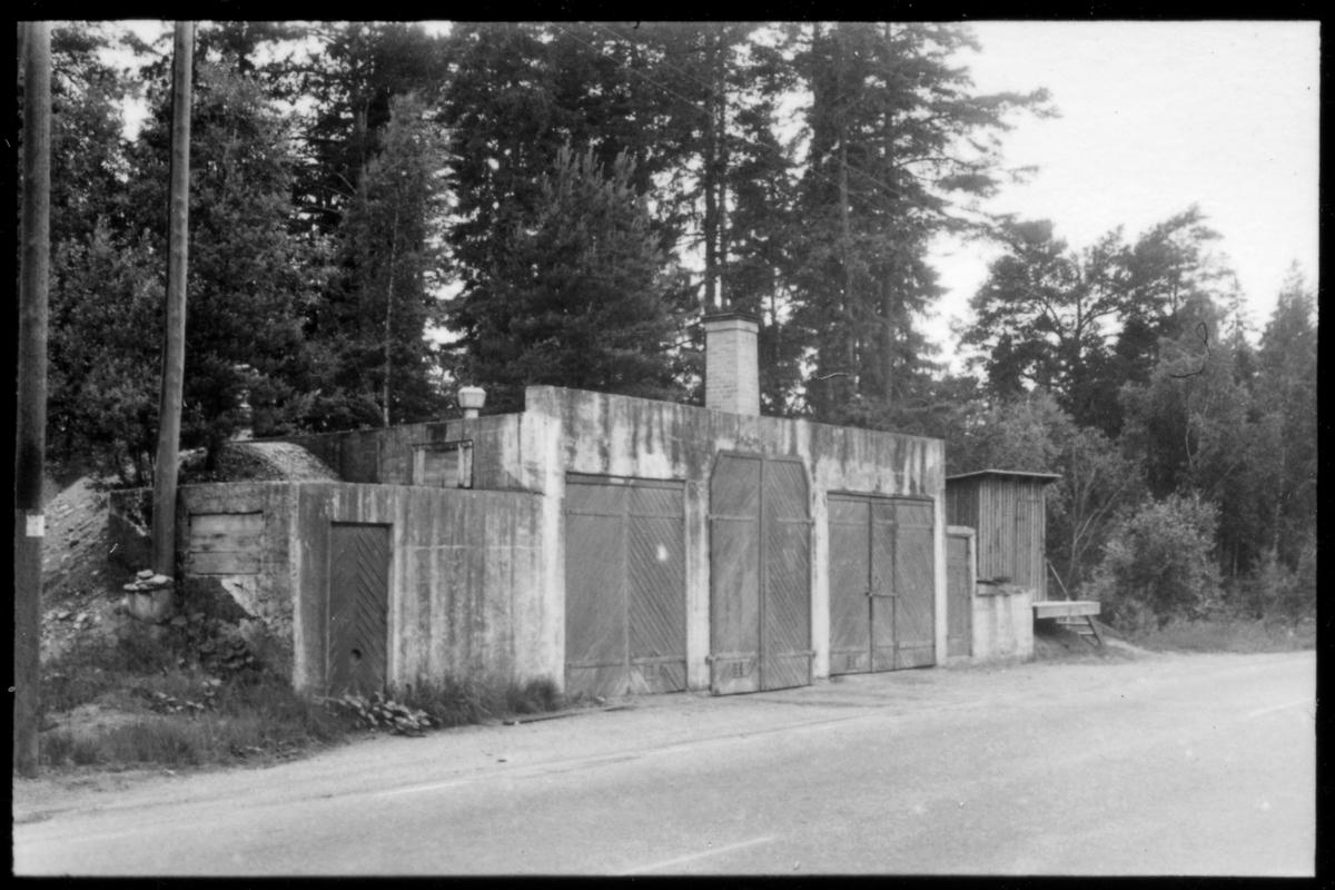Vägstation B12, Järna. Filial, Djupdal. Garagebyggnad i betong, invid väg.