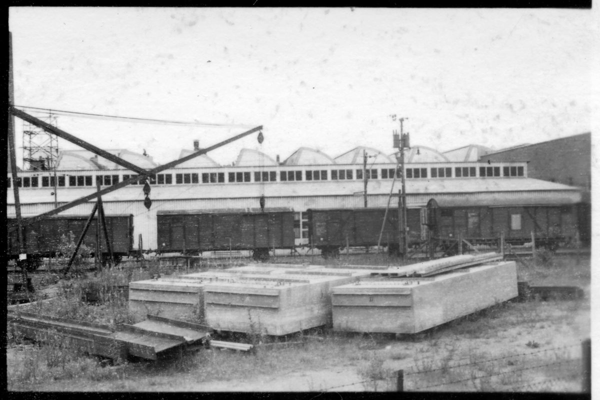 Vägstation B12, Järna. Balkupplaget, Södertälje. Järn- och betongbalkar. Järnvägsvagnar, gods, i bakgrunden.