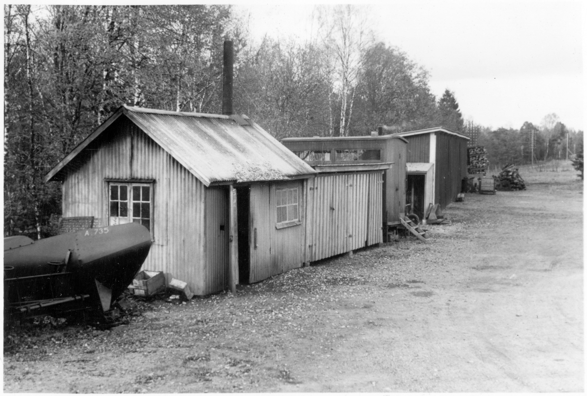 Vägstation N3, Kvibille, filial Torup. Små förrådsbyggnader. En byggnad med skorsten, eventuellt manskapets raststuga. Manskapsvagn mellan byggnaderna, rök från skorstenen indikerar även denna som raststuga för manskapet. Spetsplog till vänster, märkt "A 735".