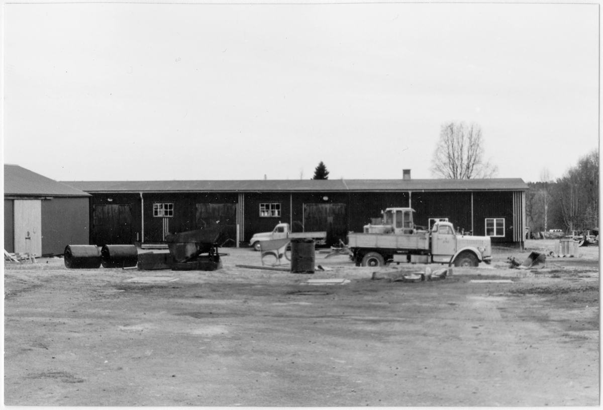 Depåförrådet VFBD. Förrådsbyggnader. På garageplan lastbil, Scania, väghyvel bakom Scanialastbilen. Närmast byggnaden liten lastbil, paketbil av märket Volvo.