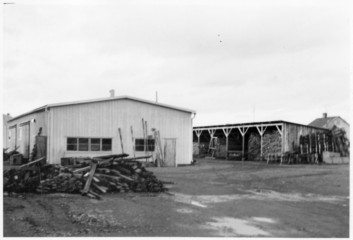 Vägstation Z11, Hammerdal. Förrådsbyggnader. Vägmärken lutade mot väggen.