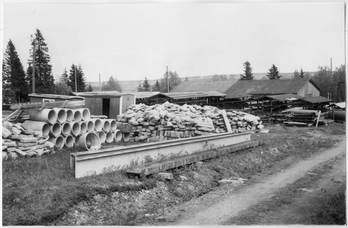 Vägförvaltningen i Västernorrlands län, VFY, Byggnadsförrådet. Vy över byggnadsförrådets gårdsplan med upplag av diverse material, såsom järnbalkar, kantsten, cementrör. Förrådsbyggnader i bakgrunden.