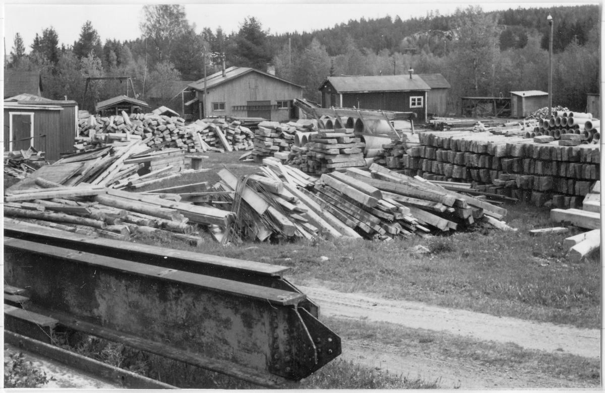 Vägförvaltningen i Västernorrlands län, VFY, Byggnadsförrådet. Vy över byggnadsförrådets gårdsplan med upplag av diverse material, såsom järnbalkar, kantsten, cementrör, trävirke. Förrådsbyggnader i bakgrunden.
