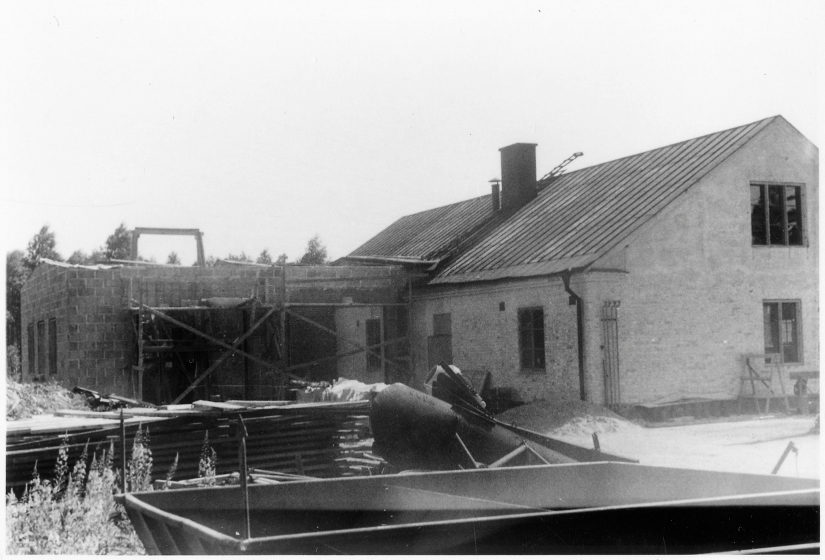 Vägstation S3, Filipstad. Garagebyggnad (baksidan). Arbete med tillbyggnad (i cementblock) pågår.