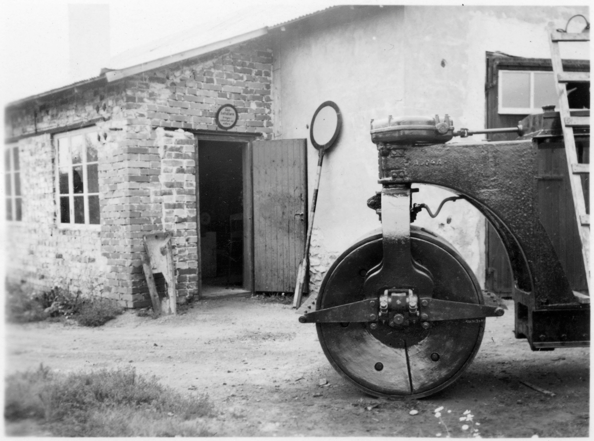 Vägstation Vmo X3, Söderala. Tegelmurad byggnad, troligen verkstad. Fronten på en vägvält. Mot väggen vägmärke "Trafikdelartavla" SFS 1937:44, § 20.
