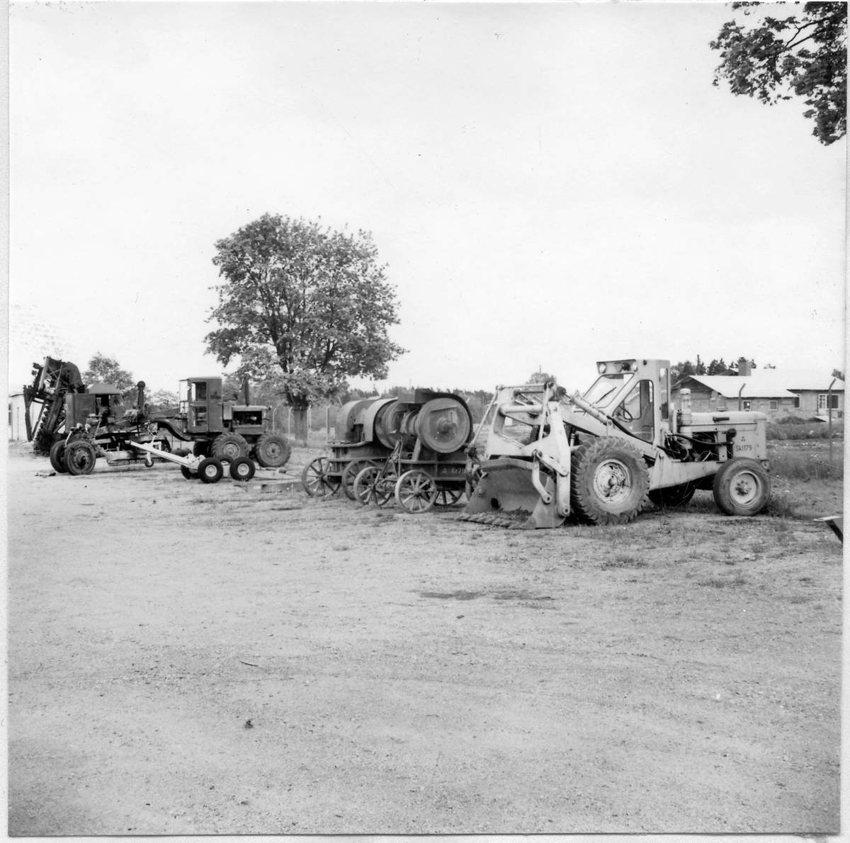 Vägstation R13, Skövde, Skultorp. Uppställda väghållningsmaskiner, inför försäljning, bland annat skopelevator (lastningselevator) Väghyvel Nord-Verk, stenkrossar, schaktmaskin med VoV-maskinnummer Sk 1179.