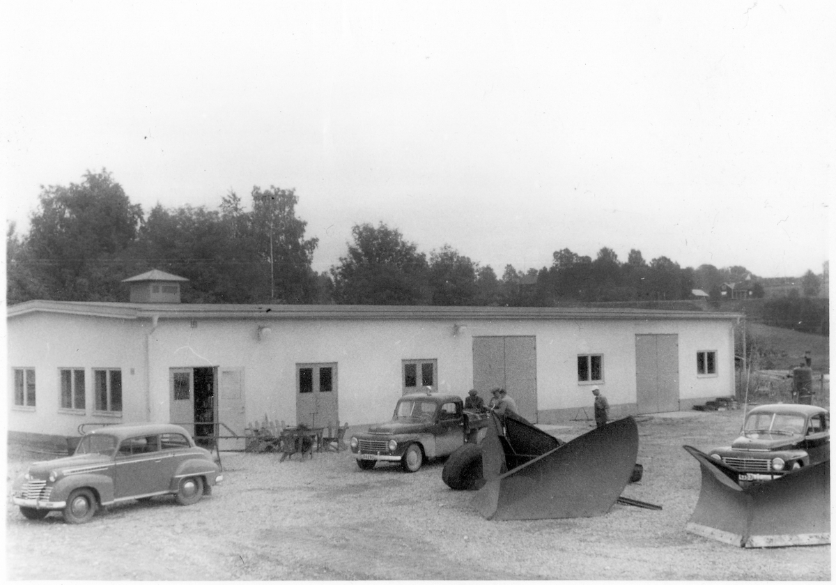 Vägstation S6, Torsby. Förrådsbyggnad. På garageplan liten lastbil (paketbil) Volvo, två personbilar varav en Volvo PV, spetsplogar.