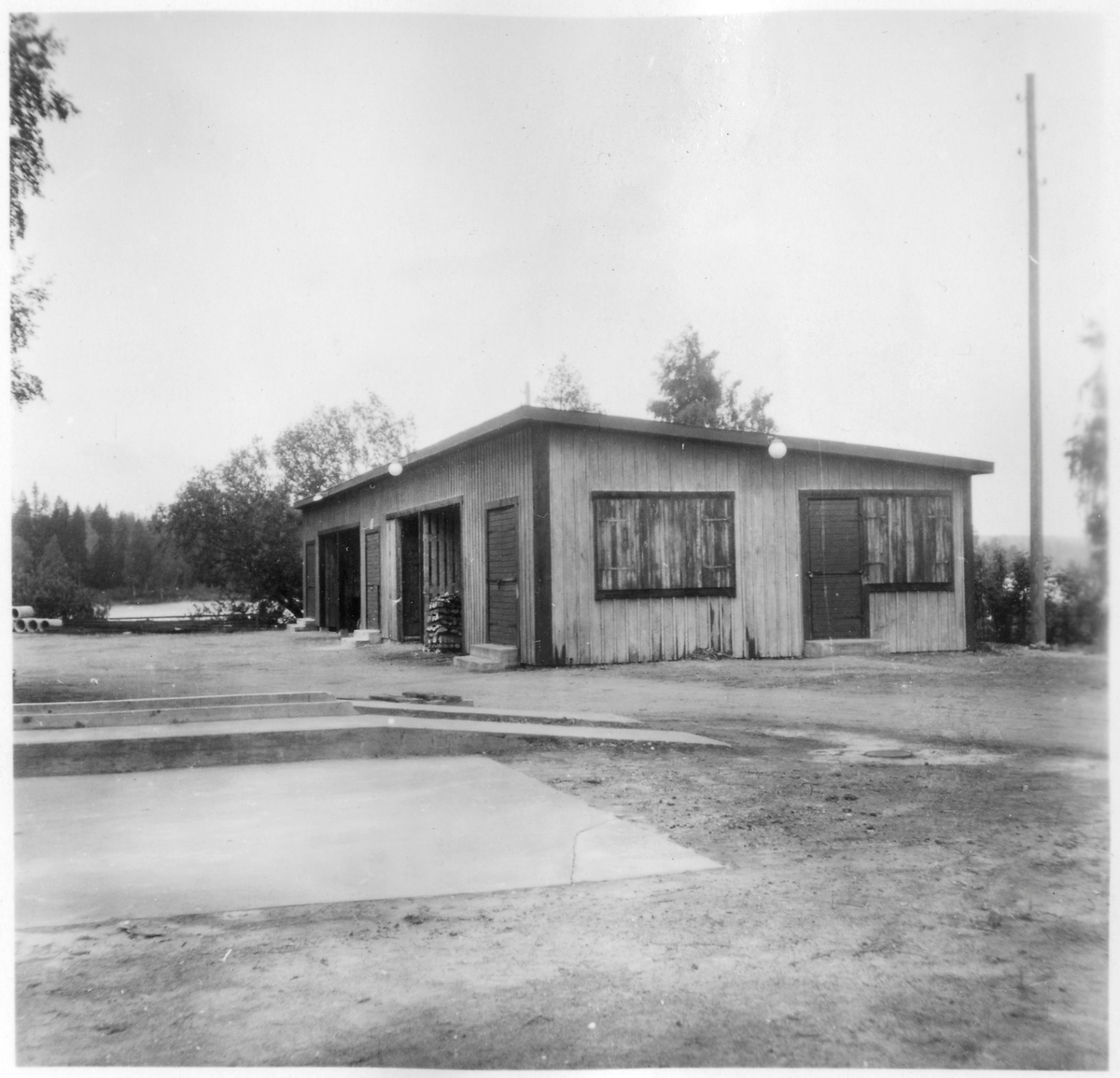 Vägstation T4, Svartå. Förrådsbyggnad. I förgrunden smörjgrop.