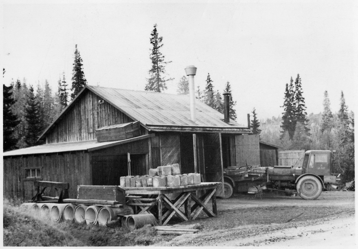 Vägstation Z7, Järpen, filial Kallsedet. Garagebyggnad med förrådsbyggnad vid sidan. Framför garaget väghyvel Munktell C1, "Långa hund" 1939 med VoV-maskinnummer Vh 392. Väghyveln tillhörde vid vägväsendets förstatligandet 1944 Undersåkers vägdistrikt. Upplag av diverse byggnadsmaterial på en "mjölkpall/mjölkbord".