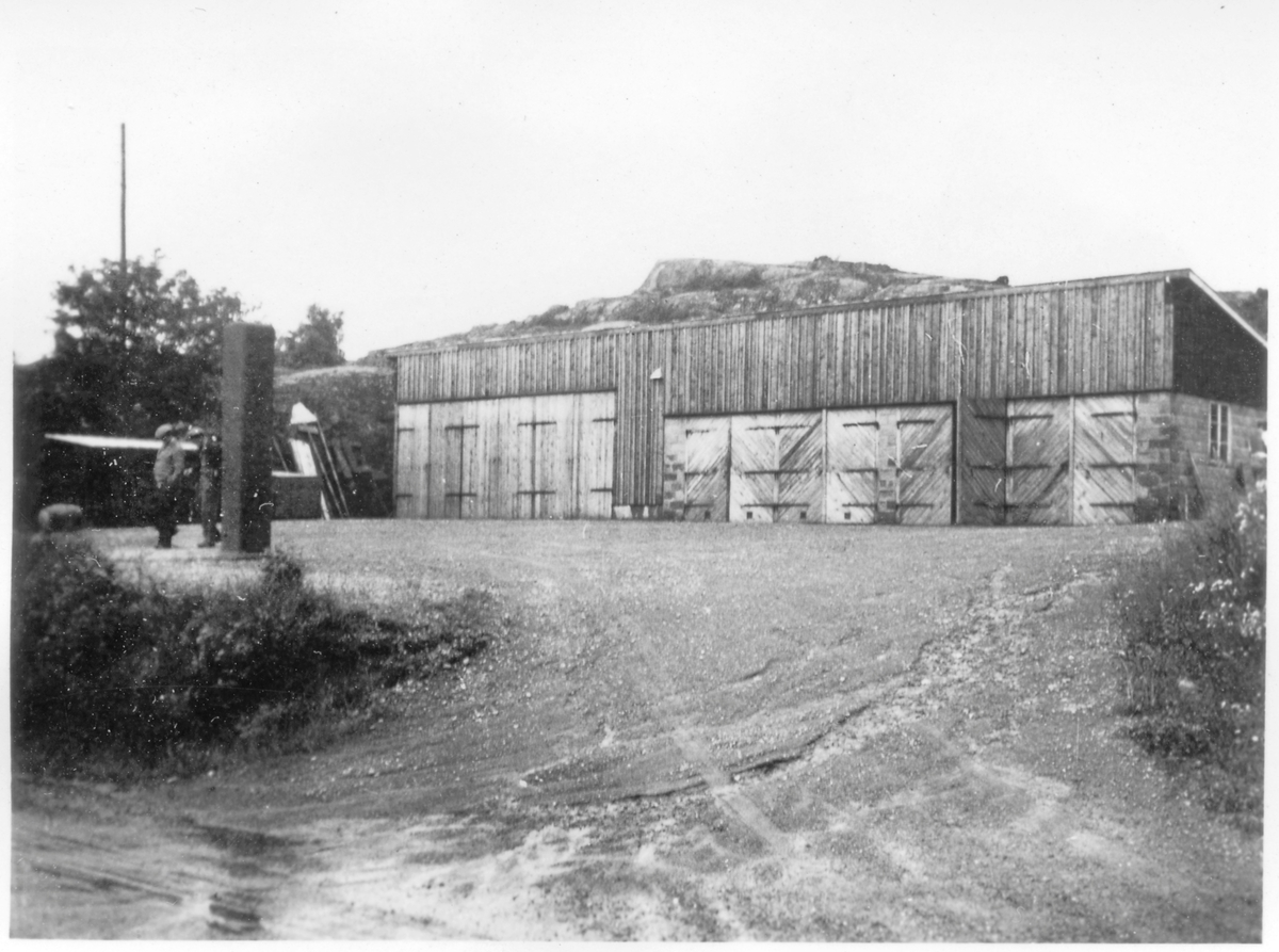 Vägstation O6, Naverstad, filial Kville. Garage- och förrådsbyggnad. Lutade mot klippa till vänster olika vägmärken. Bensinpump (drivmedelspump). Två manspersoner.