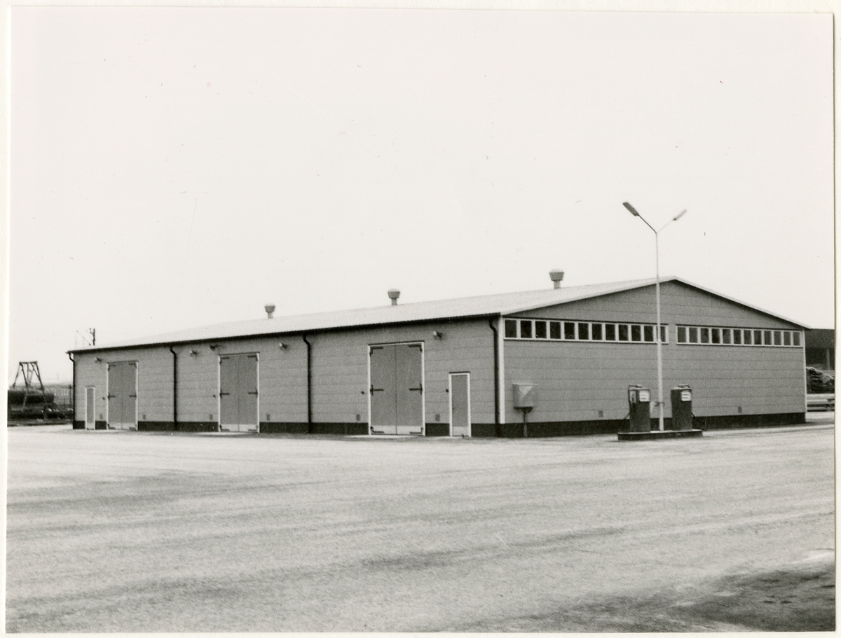 Vägstation S9 Kil. Förrådsbyggnad. Vid gaveln bensinpumpar (drivmedelspumpar). Eventuellt Vägförvaltningen i Värmlands läns, VFS:s, depåverkstad.