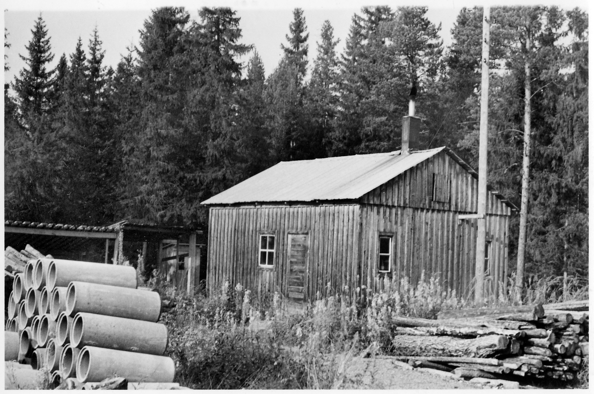 Vägstation Z10, Lit, filial Stugun. Liten byggnad, eventuellt manskapsbod. Upplag av cementrör och ved.