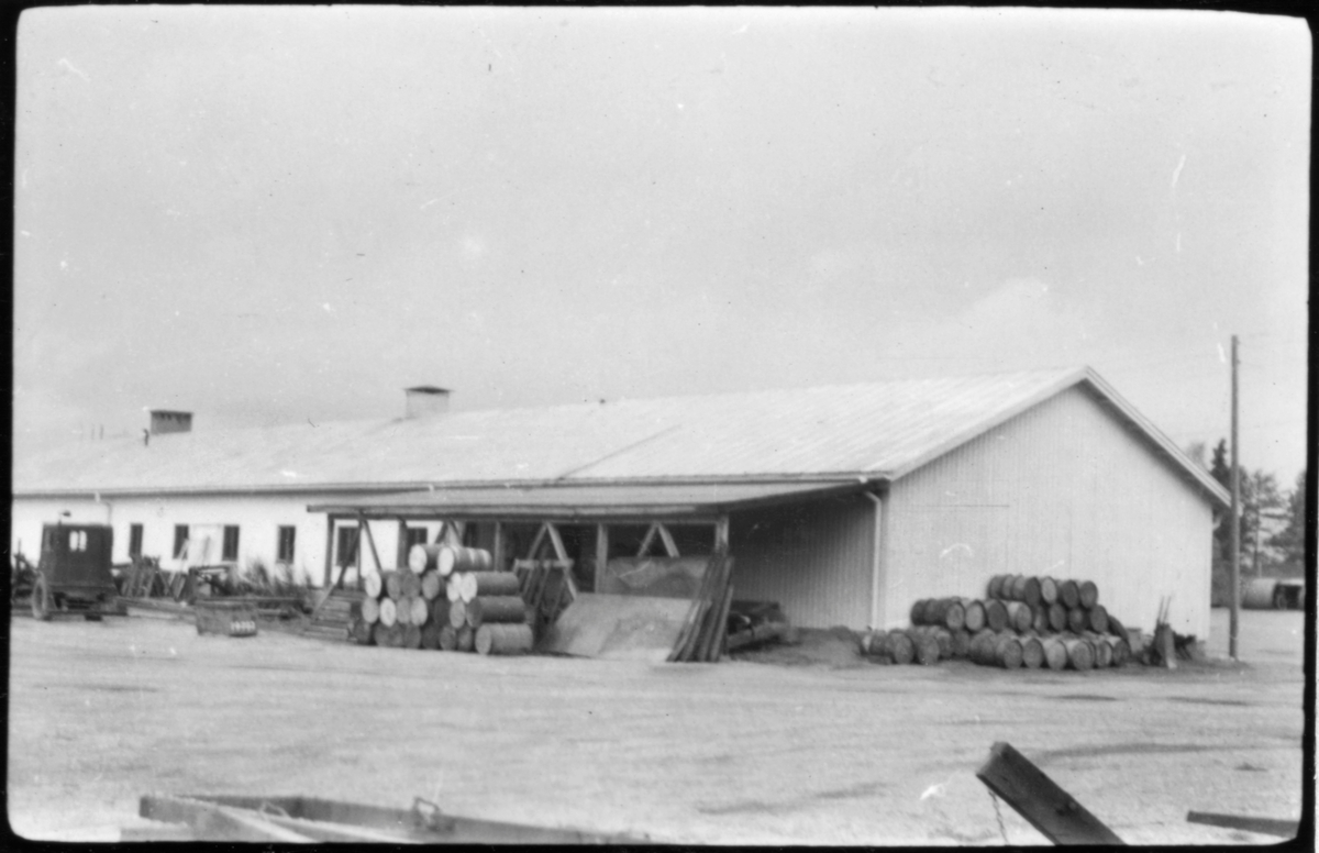 Vägstation AC 16, Åsele. Förråds- och garagebyggnad (baksidan). Väghyvel till vänster. Upplag av bränslefat och diverse materiel.