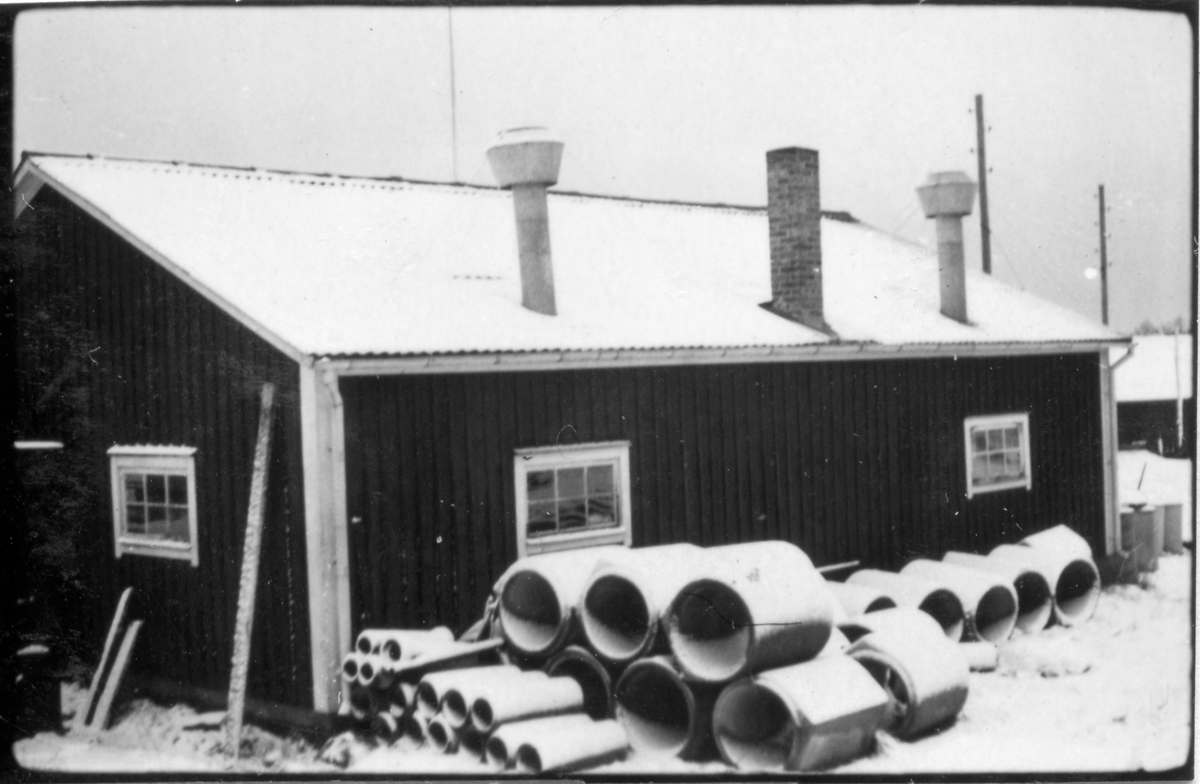 Vägstation F4, Bredaryd. Förråds- eller garagebyggnad, baksida. Upplag av cementrör.