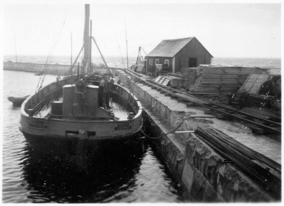 H län, Hamnförrådet i Kalmar. Avvecklades 1946. Översikt med diverse förrådsbyggnader, upplag av diverse material, "skrot". Hamnpir med järnväg. Vid kajen träskutan "Bertha, Stockholm". På däck en mansperson.