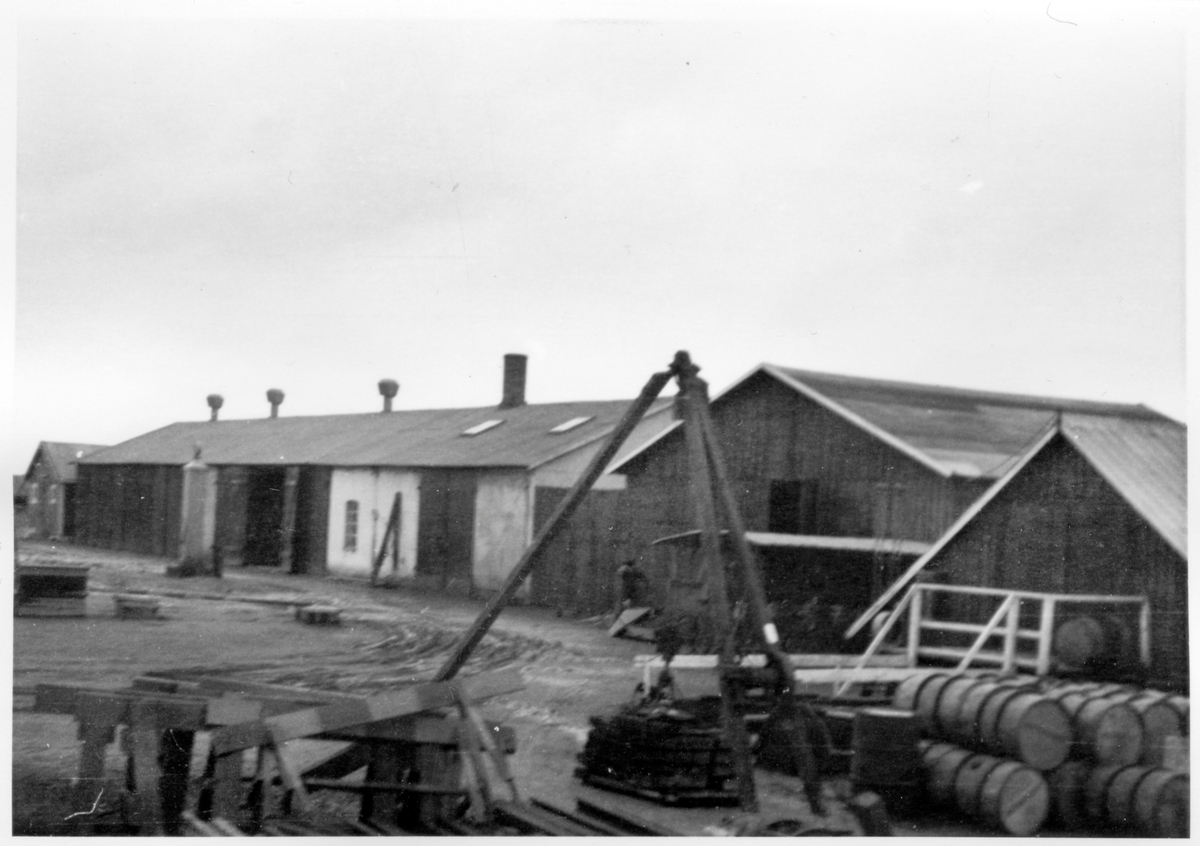 Vägstation L8, Vitaby. Garagebyggnad och förrådsbyggnader. Sten- och stubbrytare i förgrunden. Diverse material, bland annat bränsle.