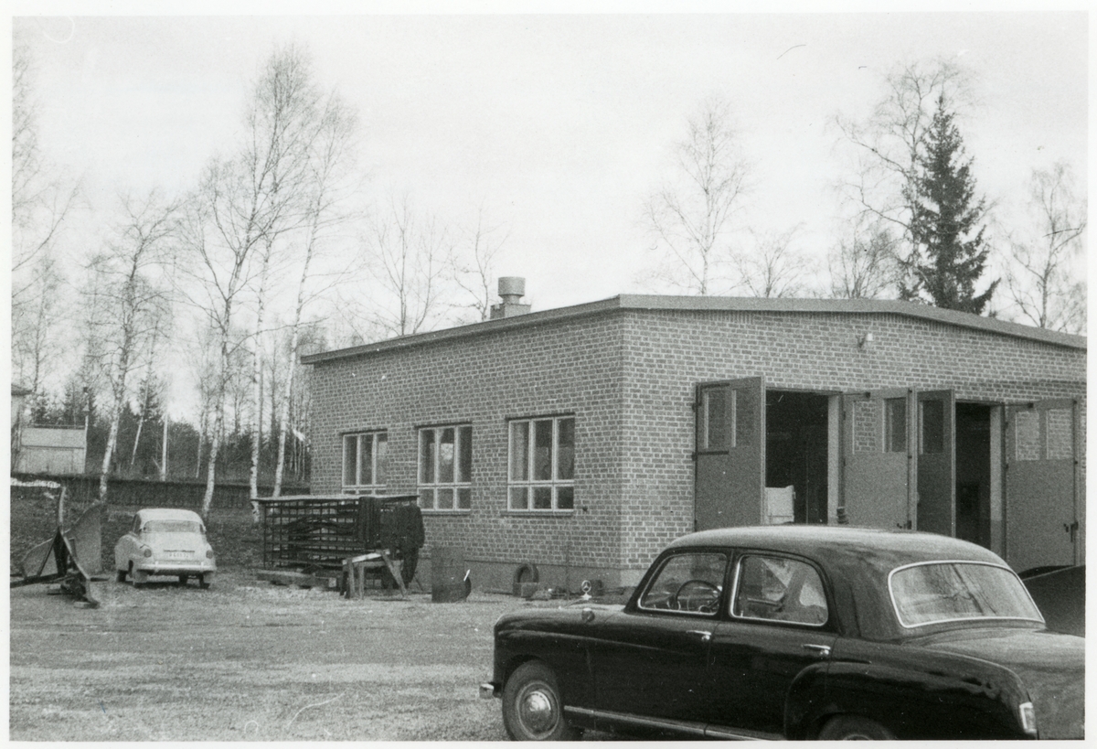 Vägstation B5 Rimbo. Verkstadsdelen. På garageplan personbil Mercedes, B66889, personbil SAAB.