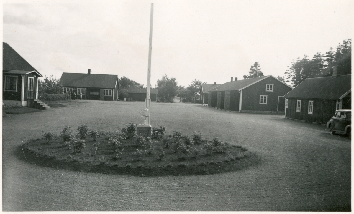 Vägstation N1, Hov. Vy från bostadshuset över garageplan med olika förrådsbyggnader. Flaggstång i förgrunden.