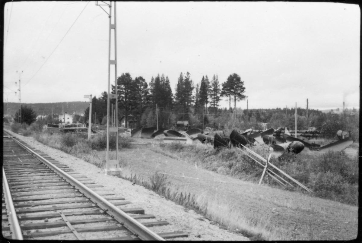 Vägstation AC5, Vindeln. Uppställning av spetsplogar och sidoplogar. Invid elektrifierad järnväg (Stambanan genom övre Norrland).