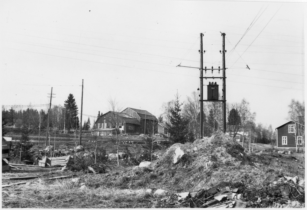 Vägstation Y6, Älandsbro. Baksidan av garagebyggnaden. Vy mot bostadshus och bondgård.