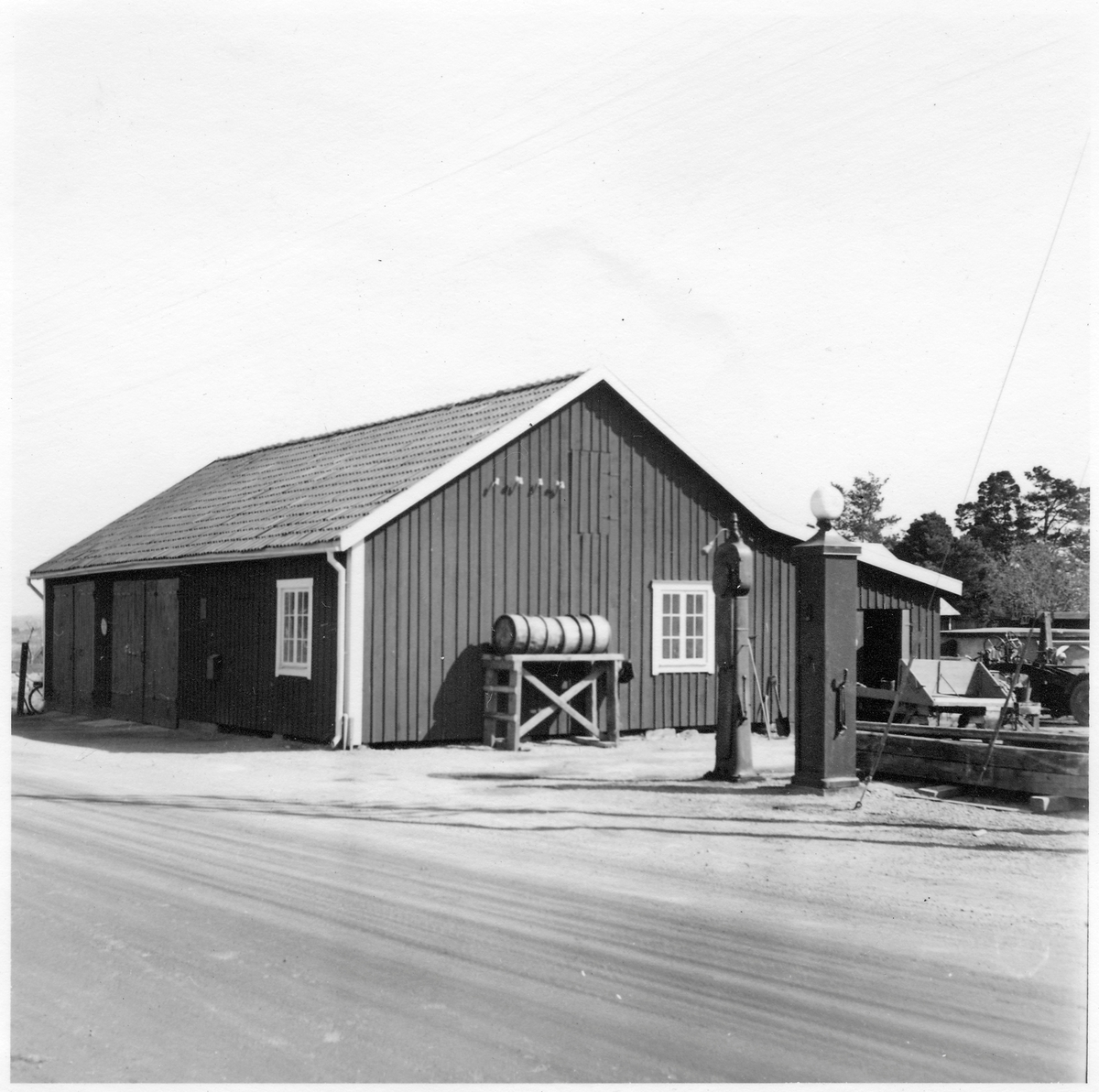 Vägstation B12, Järna. Garageanläggning, invid väg. Bensinpumpar (drivmedelspump). Sandspridare, väghyvel.