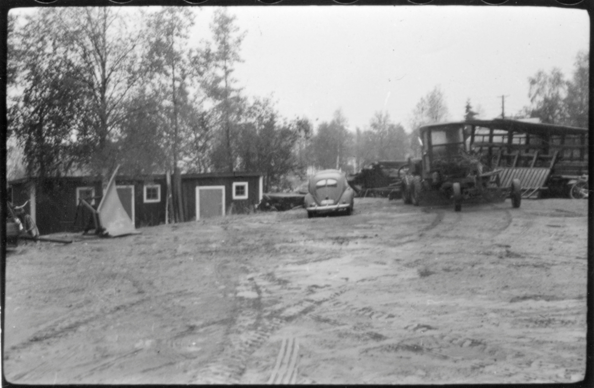 Vägstation AC18, Vilhelmina. Garageplan med förrådsbyggnad. Sidoplog, väghyvel och personbil Volkswagen.