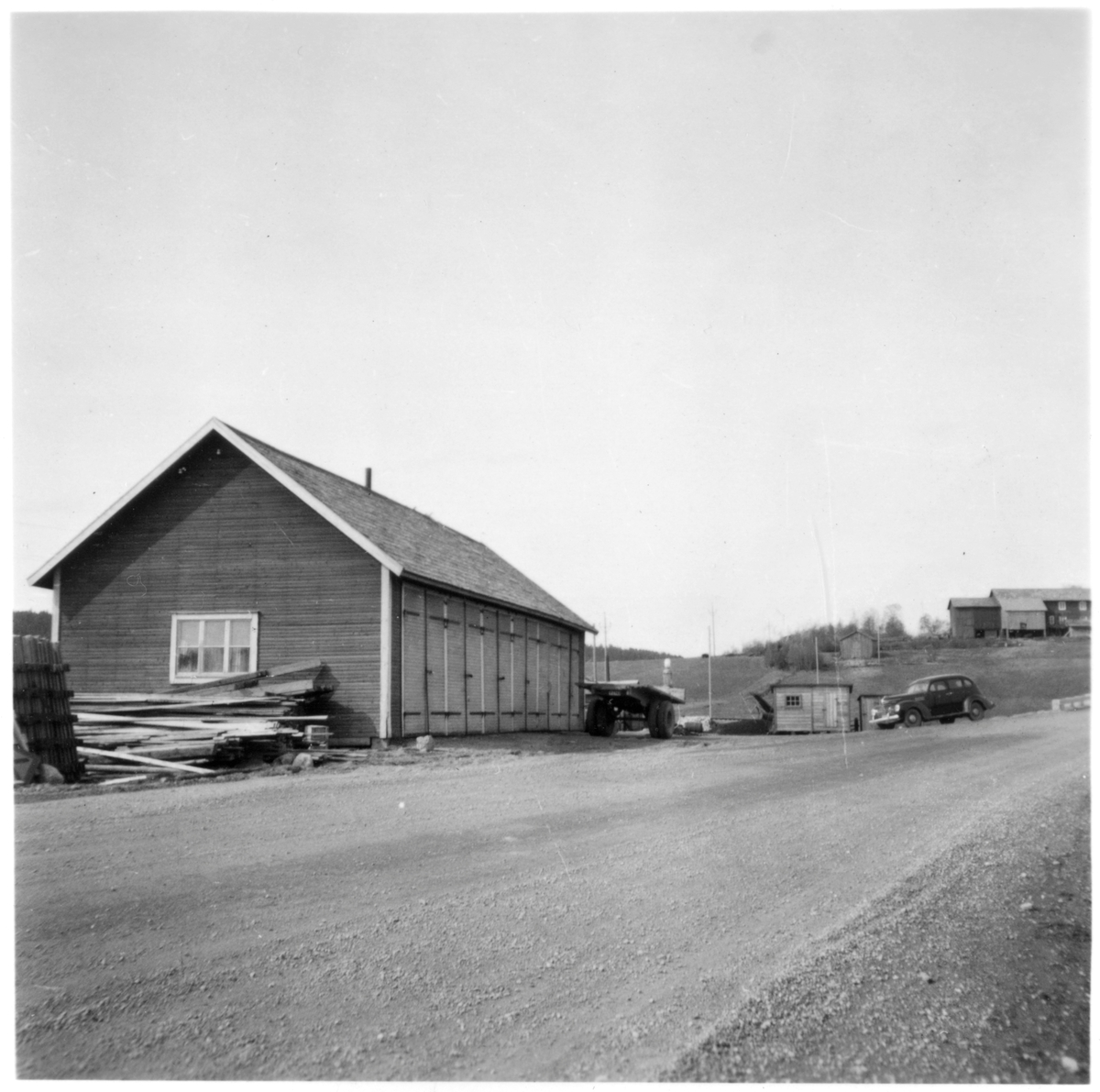 Vägstation Y10, Arnäsvall. Garagebyggnad. Enaxlig släpkärra till lastbil utanför garaget. Bensinpump (drivmedelspump) vid bortre gaveln. Personbil vid vägkanten. I bakgrunden bondgård. Invid väg.