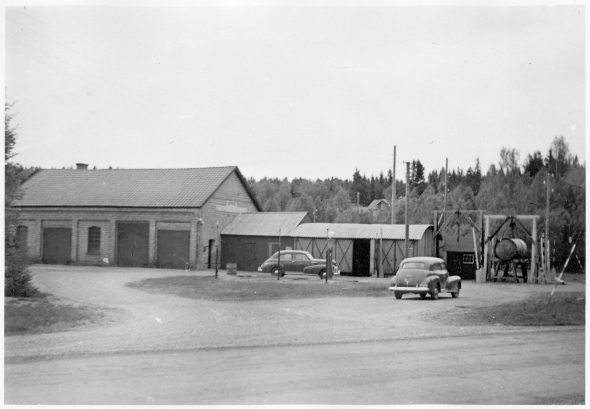Vägstation S9 Kil. Garagebyggnad och förrådsbyggnader. Bensinpump (drivmedelspump), två personbilar. Luttunna till höger. Invid väg.