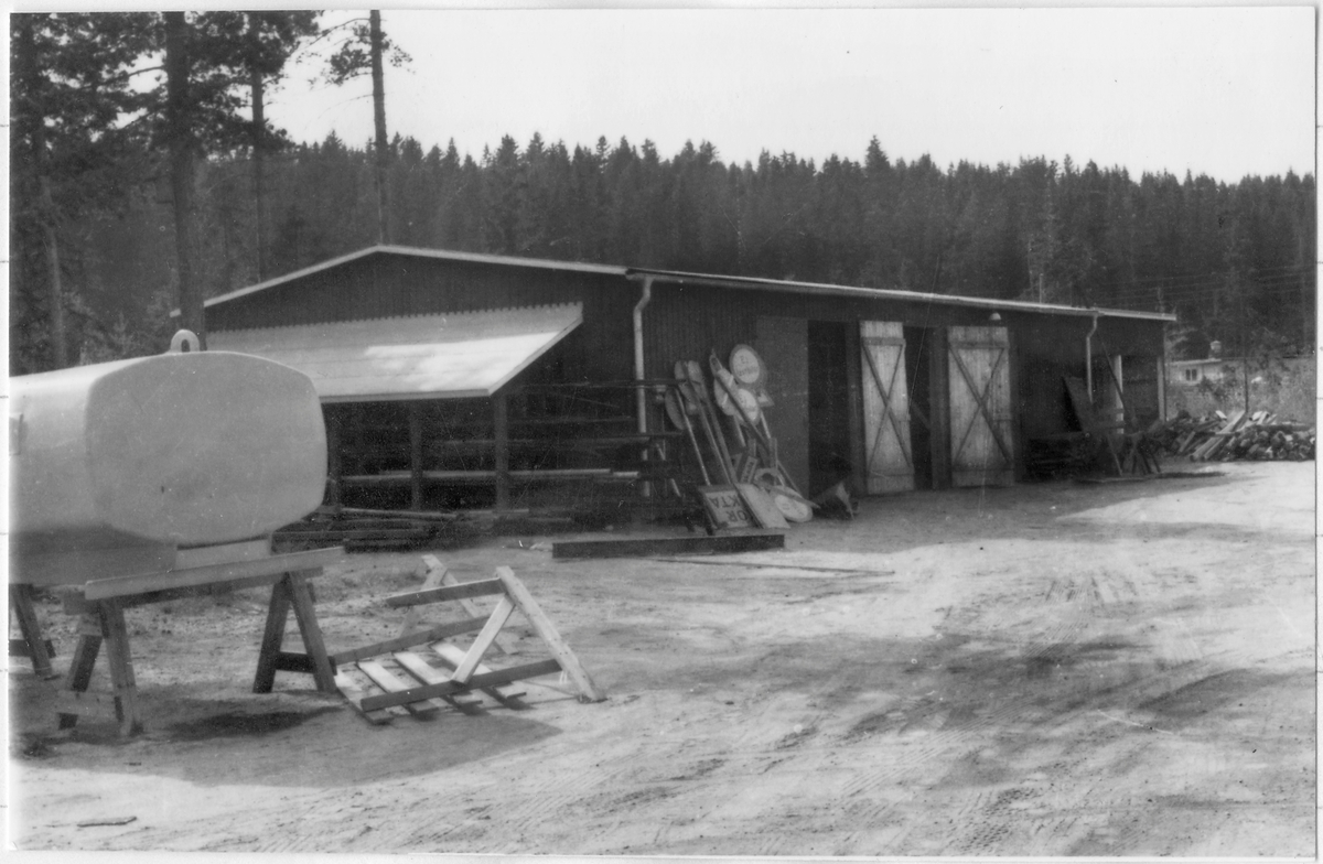Vägstation Y5, Timrå. Förrådsbyggnad. Vägmärken uppställda mot byggnaden. Vattentank till vänster.